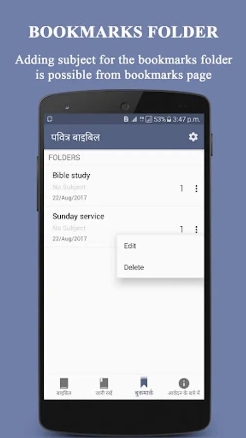 ★ Bookmark is one of the most highlighted features that can be done with the help of the bookmark option. A verse can be bookmarked in a single touch. The bookmarked verse can be saved folder wise. Renaming of folders is possible.