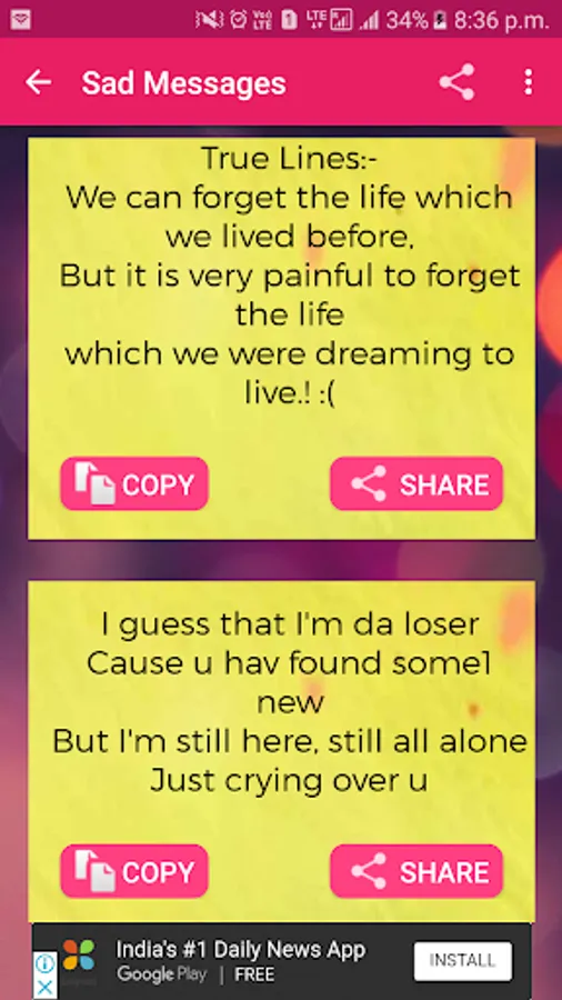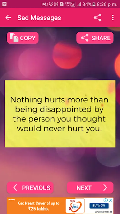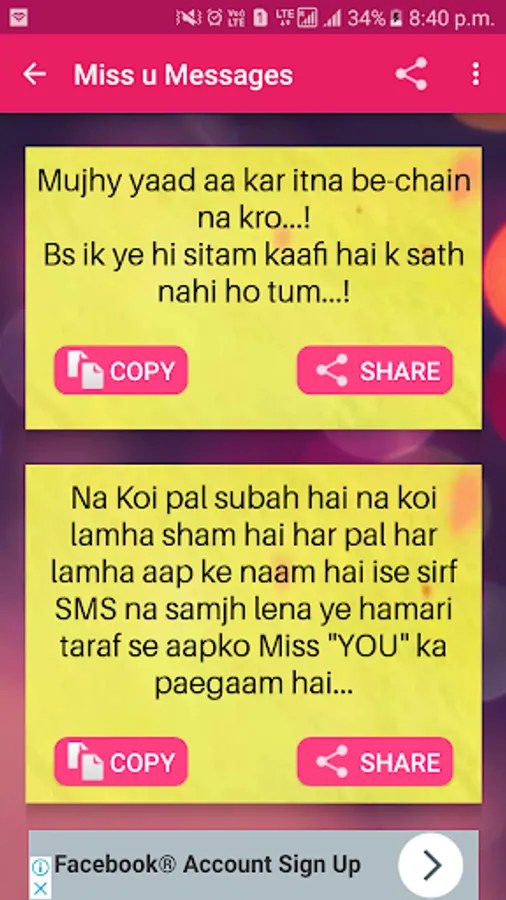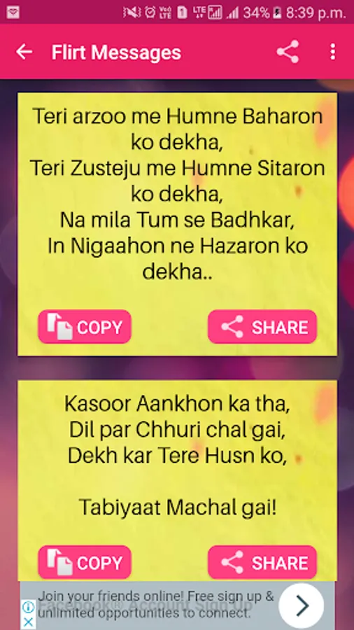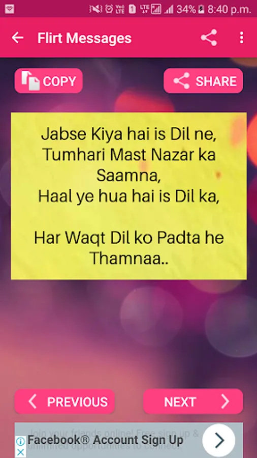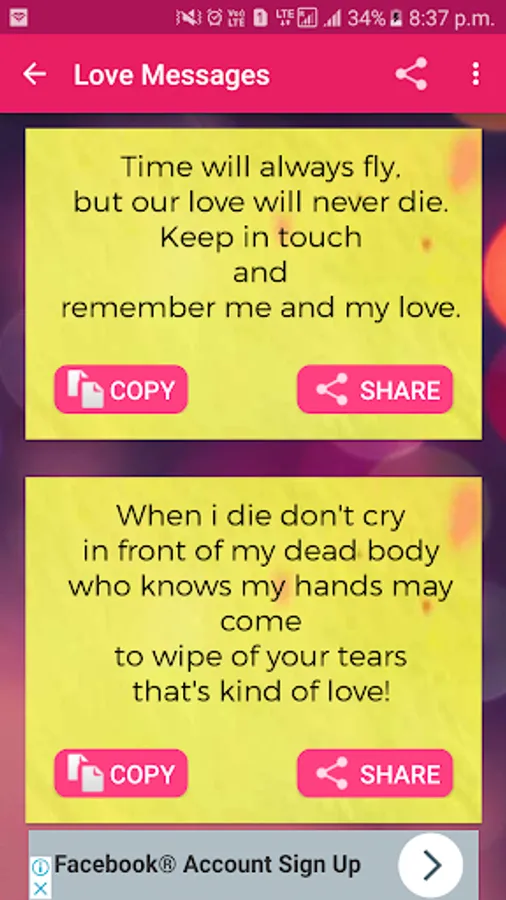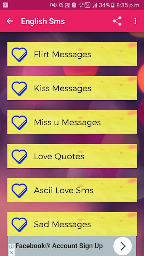 Love is one of the best feeling that human being can feel .so dont hide your feeling and start share with your love using this amazing collection of love sms messages app that will give you large collection and heart touching message .It is in both language english and hindi .