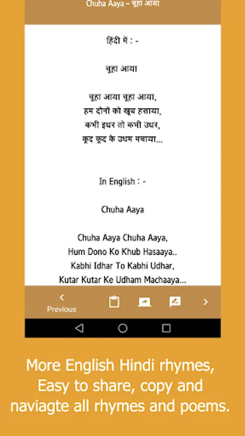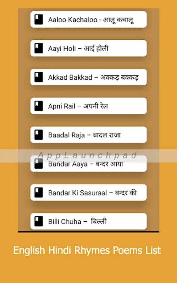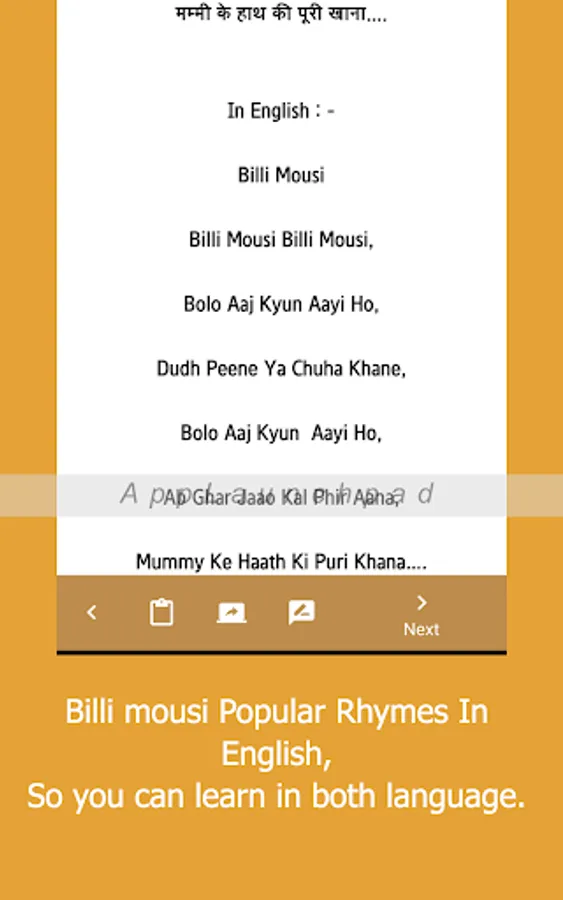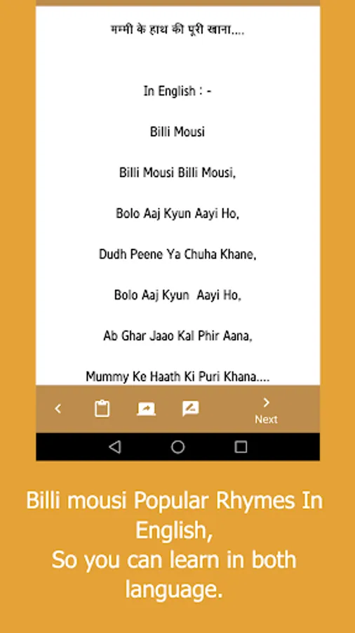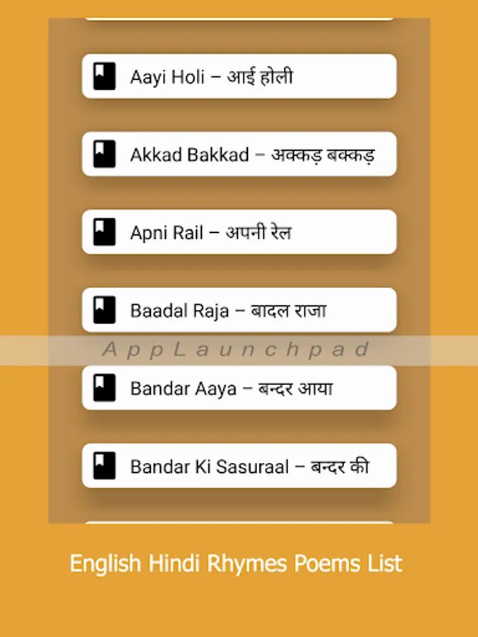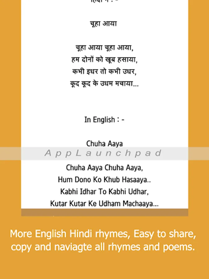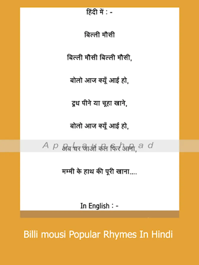This app for Hindi English Rhymes childhood Lover. You can share various childhood nursery rhymes like : billi mousi,machli jal ki rain hai,ek chidiya,lori,upar pankha, chalta hai ,nani etc.