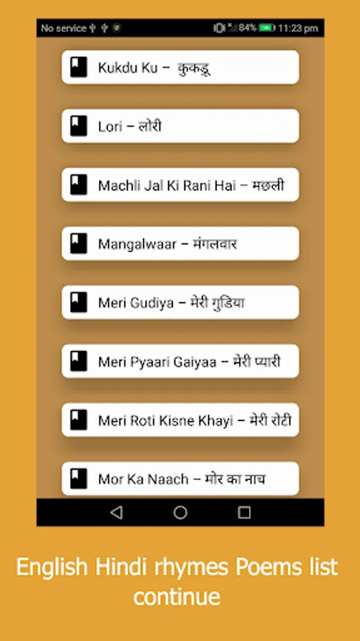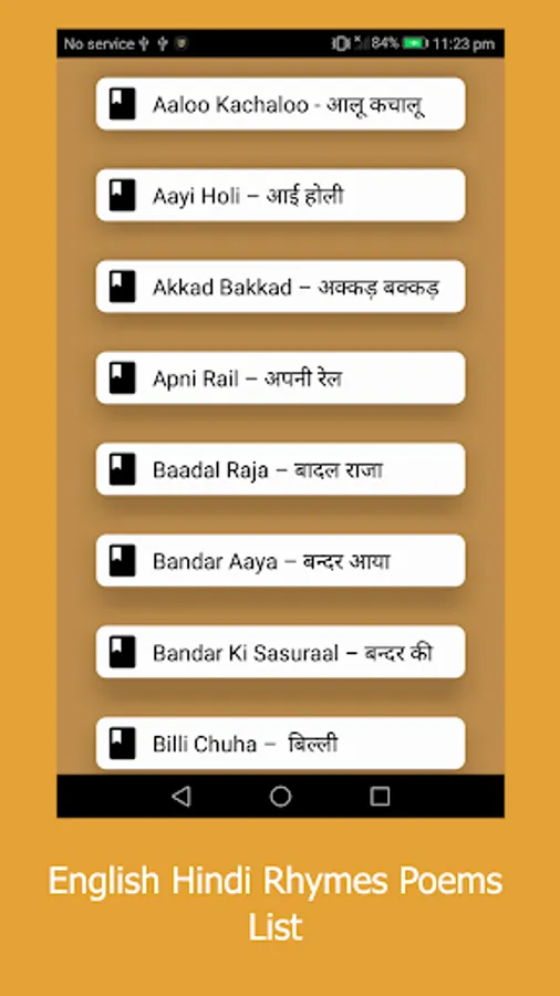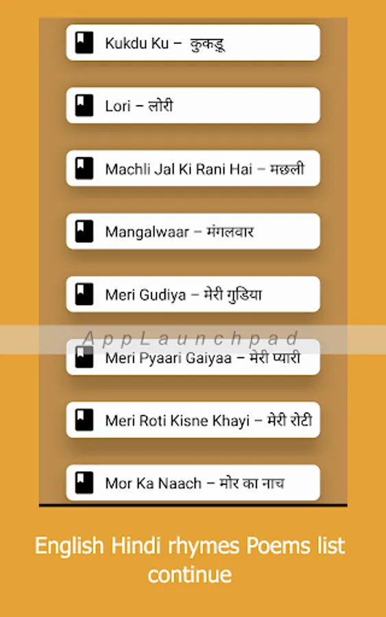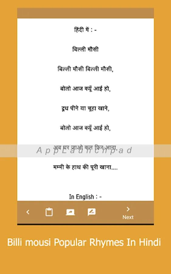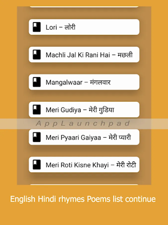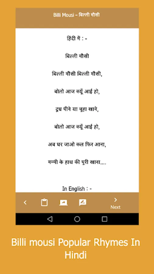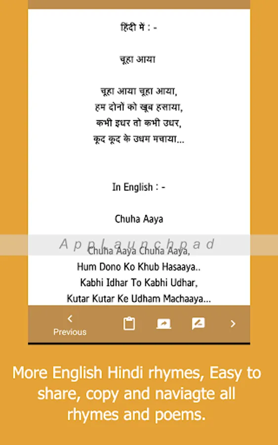 This app for Hindi English Rhymes childhood Lover. You can share various childhood nursery rhymes like : billi mousi,machli jal ki rain hai,ek chidiya,lori,upar pankha, chalta hai ,nani etc.