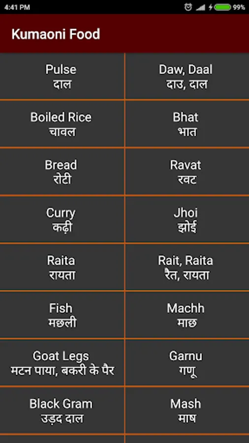 This app uses English, Hindi and there translation in Kumaoni words.