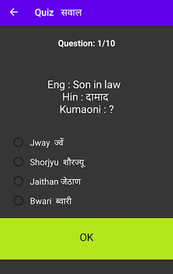 This app is helpful in communication with Kumaoni People in their own language. The app include many of the basic knowledge related to Kumaoni Language such as how to pronouns people in kumauni. What are the different food items and what festival they are celebrate in Kumaoni. There is also a quiz section to check your knowledge on kumaoni puzzles and knowledge related to the language.