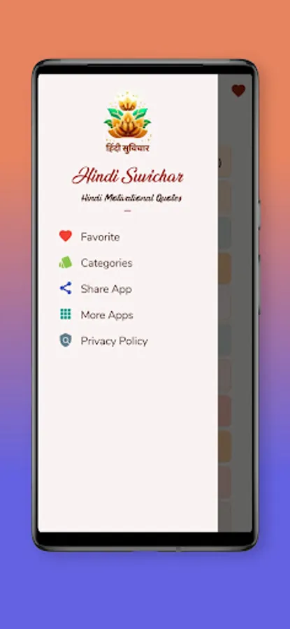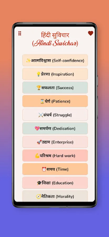 Welcome to Hindi Suvichar - Motivational Quotes, the ultimate app for finding inspiring and uplifting quotes in Hindi. Discover a vast collection of suvichar (quotes) from various categories including आत्मविश्वास (Self-confidence), 💡प्रेरणा (Inspiration), 🏆सफलता (Success), ⌛धैर्य (Patience), ⚔️संघर्ष (Struggle), 💖समर्पण (Dedication), 🚀उद्यम (Enterprise), 💪परिश्रम (Hard work), ⏰समय (Time), 🎓शिक्षा (Education), 🧭नैतिकता (Morality), 👫दोस्ती (Friendship), ❤️प्रेम (Love), and many more.