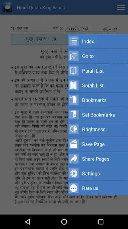 * Advanced navigation using Go to page number, Parah , Surah, Manzil and Sajda index helps to navigate easily.