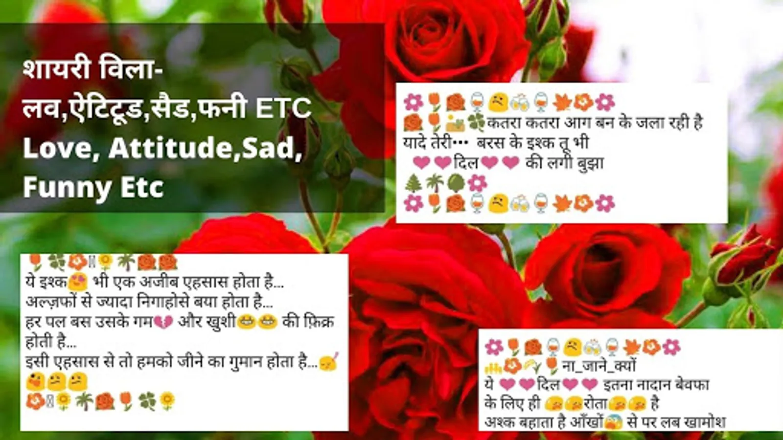 This type Shayari covered in this app Hindi Shayari (Love, Ishq, Pyar Mohabbat, Attitude Shayari,Mother Shayari,Josh Shayari,Love Quotes, Motivational Shayari, Funny Shayari etc).