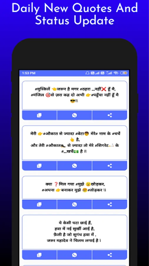I am sure your friend will also like these Latest hindi Status 2023. So what waiting for read below the hindi Status 2023 for whatsapp and make the best one you like as your Best hindi Status in 2023. You can also share this app with your friends by clicking the social share icons given at the end of app.