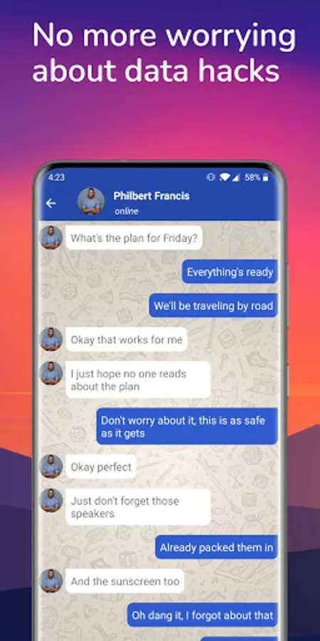 Secure: The primary goal of this app was to create a highly advanced encryption algorithm to ensure absolute privacy. With SafeChat, no more worrying about your data being sold or getting hacked. It ensures absolute isolation of each message from the outside world.