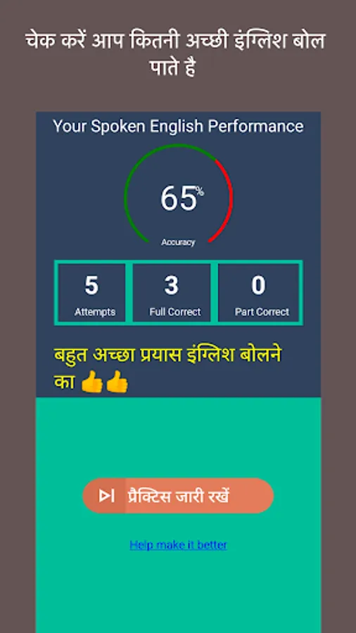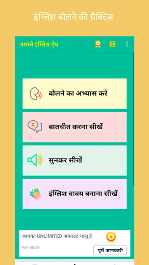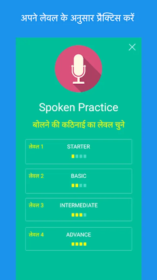 1. Spoken English practice levels: The app offers four levels of spoken English practice, from simple sentences to complex conversations. You can practice Angreji by speaking (Bol Bolkar).