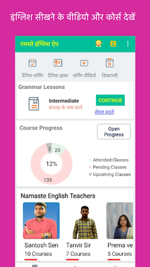 Namaste English is an app that helps Hindi medium people practice spoken English and learn English grammar. This spoken english app helps you in practicing speaking english over phone. It is English Sikhane Wala app (इंग्लिश सीखने वाला ऐप) for Hindi medium people.