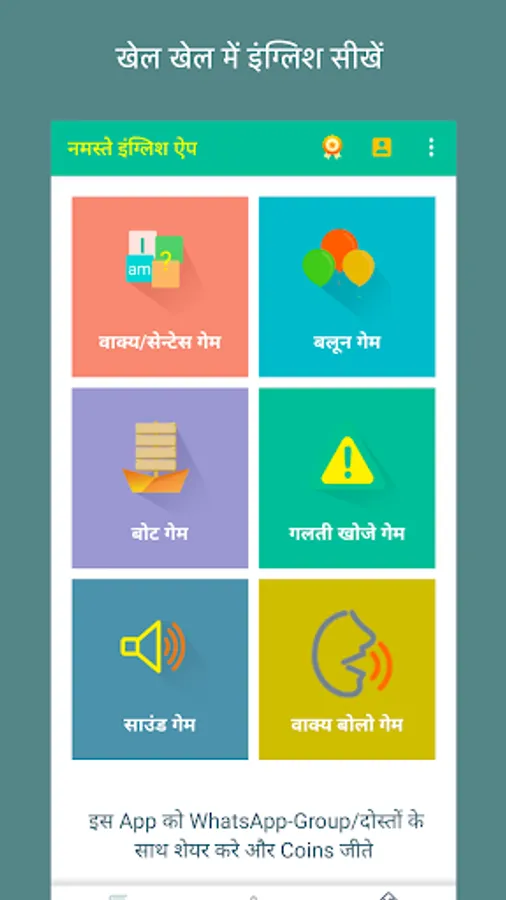5. Learn English by games: Many games for English learning are provided to make it fun to learn. It has balloon game, boat game, missing words game to improve vocabulary. Use this app to learn by playing ( game Khel Kar Sikhane Wala app).