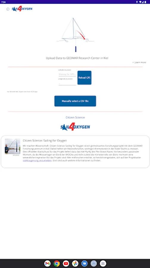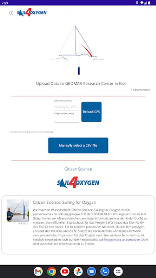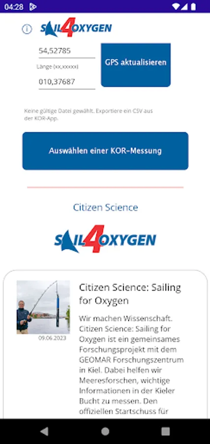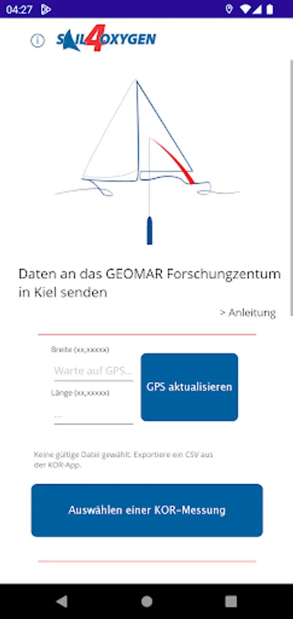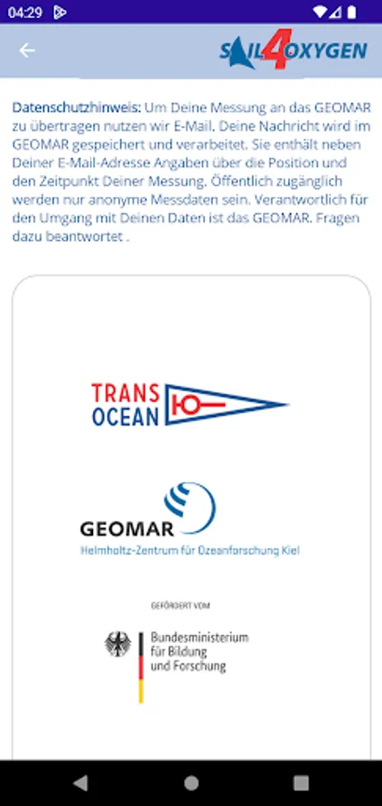 Doing research together and fishing for measurement data in the Baltic Sea. - The companion app to the research project Citizen Science: Sail for Oxygen (sail4oxygen) by GEOMAR Helmholtz Center for Ocean Research Kiel and Trans-Ocean - Association for the Promotion of Offshore Sailing and funded by the Federal Ministry of Education and Research is here. She will keep you up to date on the latest developments relating to the project. It also supports you in transmitting measurement data from probes to GEOMAR in the correct format. (The app from the probe manufacturer is also required to download the data from the probe to the smartphone) All information about the project and how to get to the measuring probes is also available at sail4oxygen.org.