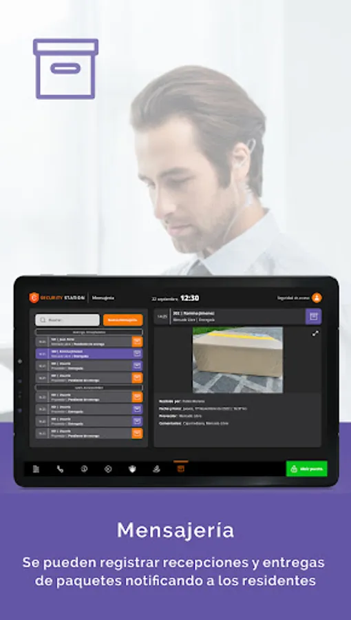 • Deliveries: The guard will be able to receive all shipments that arrive for the residents, register them in the system, notifying the resident of said receipt and recording the delivery when the resident picks it up.