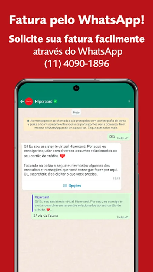Now your financial routine is more practical and faster with Whatsapp! You can request and consult an invoice, request a barcode, consult purchases and payments, delivery status of the 2nd copy of your credit card, invoice agreement and much more!