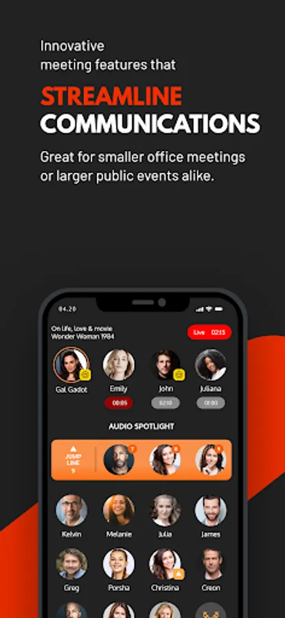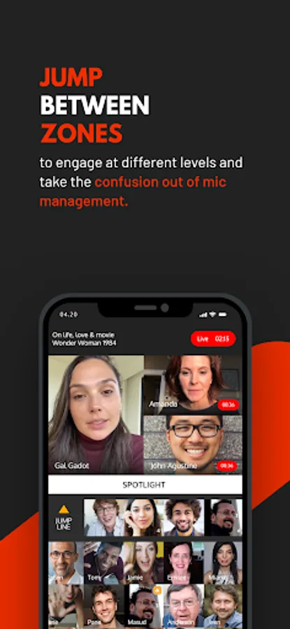 JUMP: Audience members can then easily JUMP to the Spotlight to speak and then JUMP off when finished, thereby eliminating all the mic confusion that often occurs in virtual gatherings.