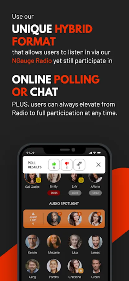 NGauge Radio (Audio-only): This is our Audio-only format that eliminates video from the equation, while still maintaining all the powerful features that NGauge has to offer. This includes our JUMP, JUMP LINE, chatting, polling, Spotlight timers, recording, monetisation, and fundraising.
