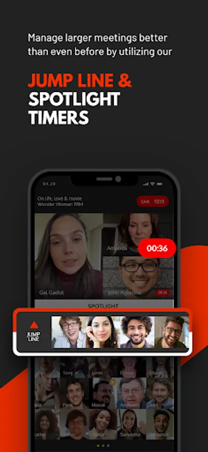 JUMP LINE & TIMERS: For larger events the host can also enable a JUMP LINE so as to better control the flow of users coming on and off the Spotlight, as well as enable Spotlight timers .
