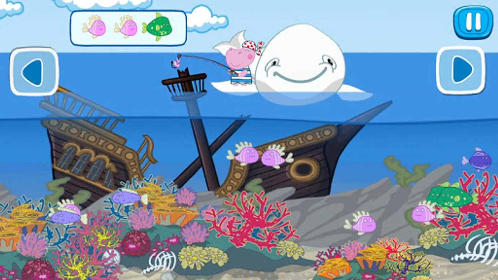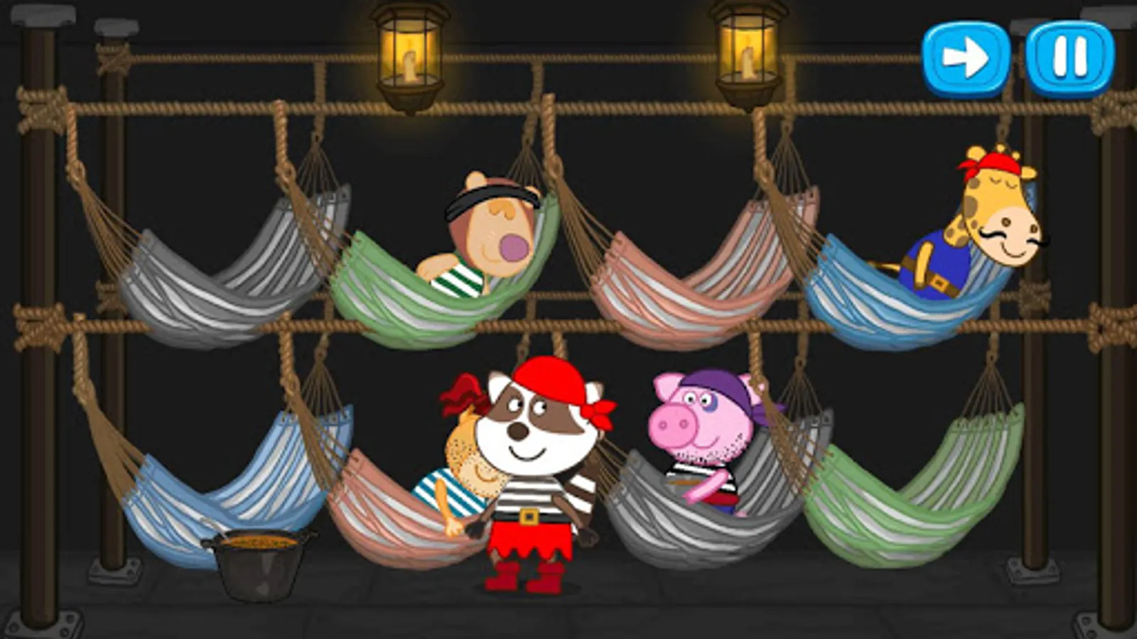 Kids fairy tales are getting interactive! These are new stories about pirates and adventures, where you could find exciting games, games for kids. We will cook dishes for pirates, travel through seas and oceans, find treasures, fight and look for exciting sea adventures! Today, princess Hippo and cook take part in the competition to be the host of all seas and oceans. A crafty cook can cook special food. He used ancient magical recipes, and the old captain felt asleep and all his pirates turned into zombies. And now pirate princess Hippo should fight with evil forces and win the bad magic. Let's start! Sails up and let's go to the open sea.