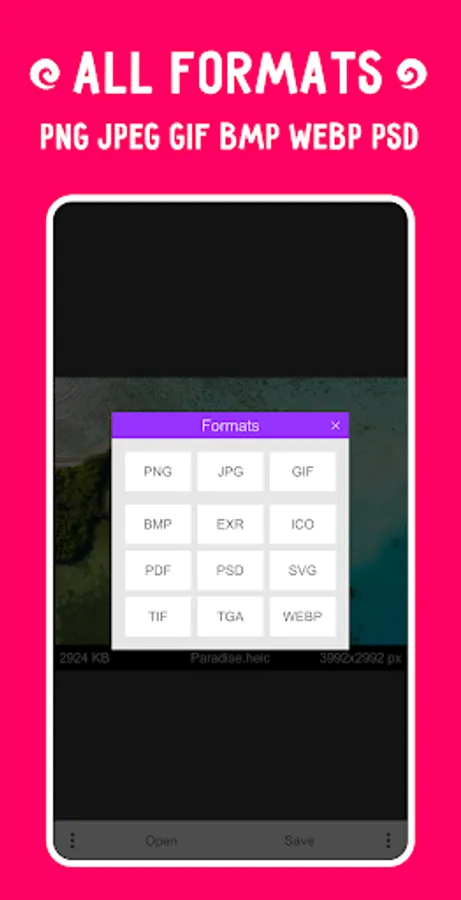 All Image Converter supports all popular image formats: PNG, JPEG, GIF, BMP, HEIC, HEIF, WEBP.