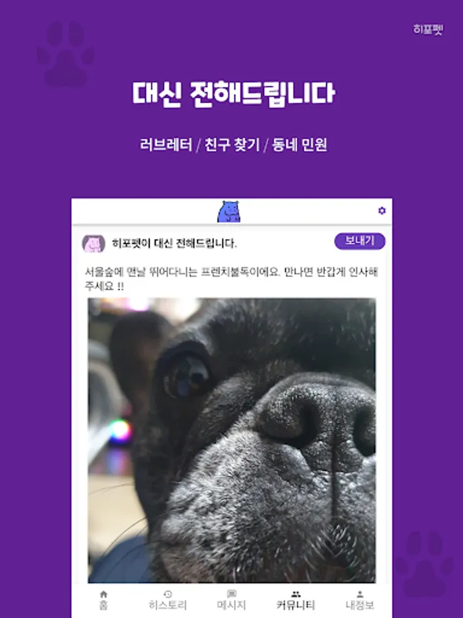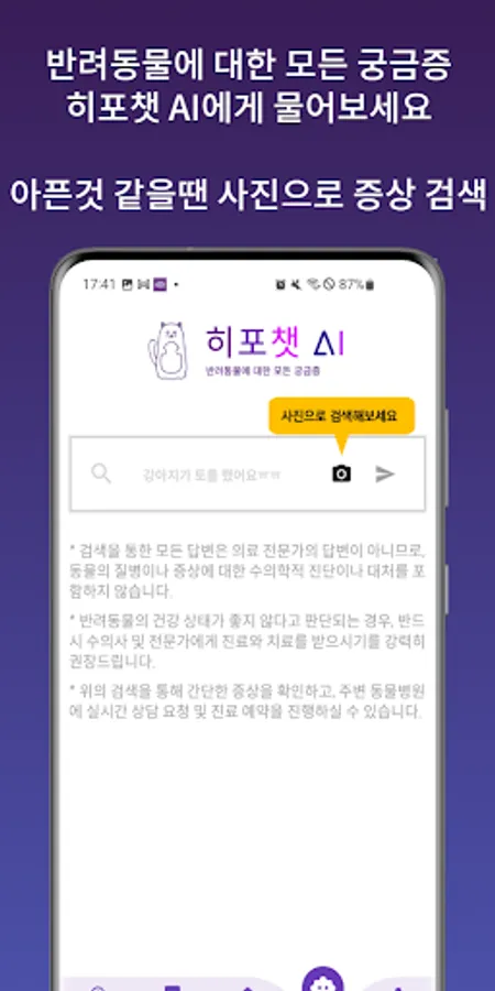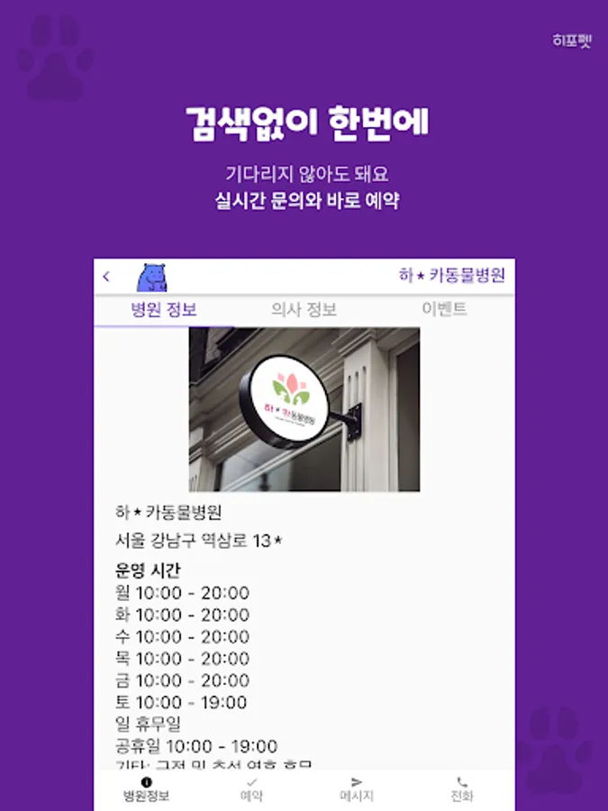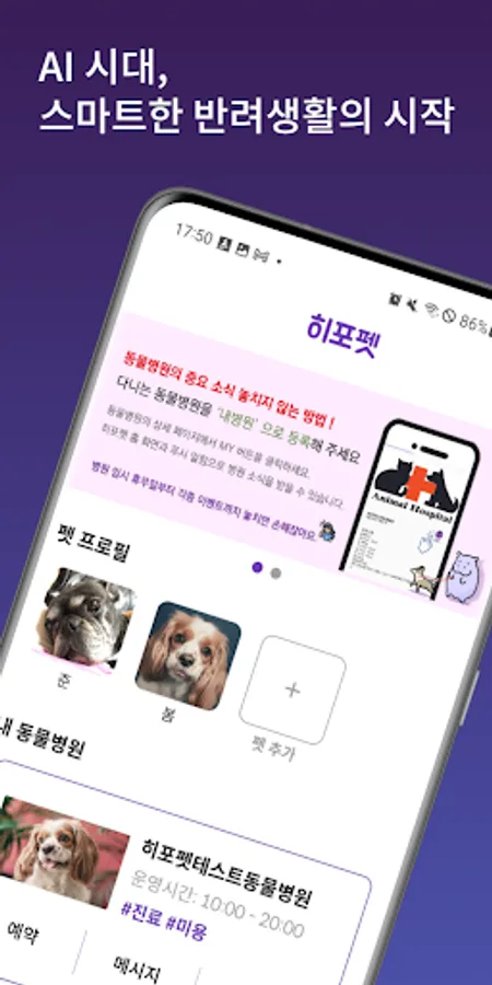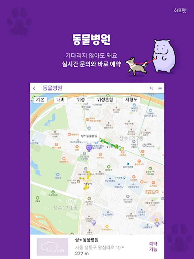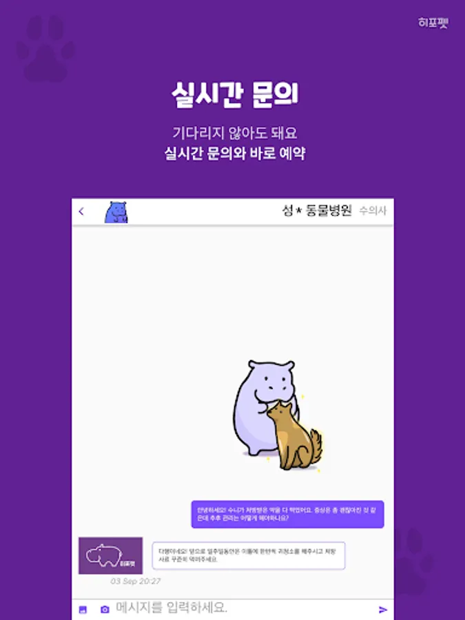 Hippopet is a comprehensive service app for companion animals. Now, with Hippopet, you can experience a smarter companion life, such as AI search for companion animals, veterinarian consultation, and real-time reservations at veterinary clinics.