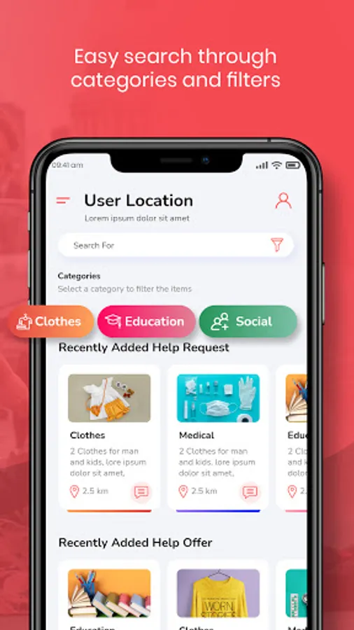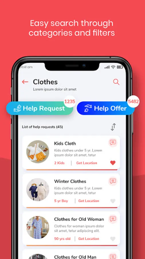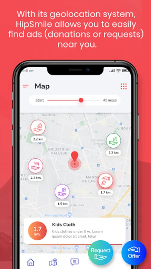 With its geolocation system, HipSmile allows you to easily find announcements (donations or requests) close to you