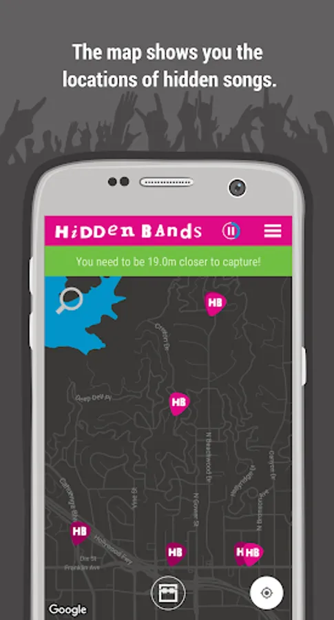Hidden Bands is an interactive rock & roll music discovery game. Players use location-based augmented reality to find, discover, rate and re-hide unreleased rock songs from up-and-coming artists.