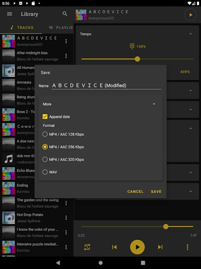 ★ Save / Export reverse & modified track to: mp4/aac/wav