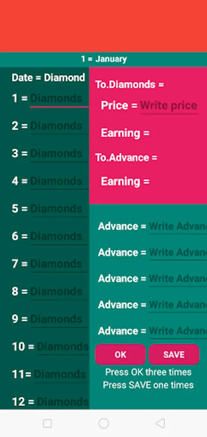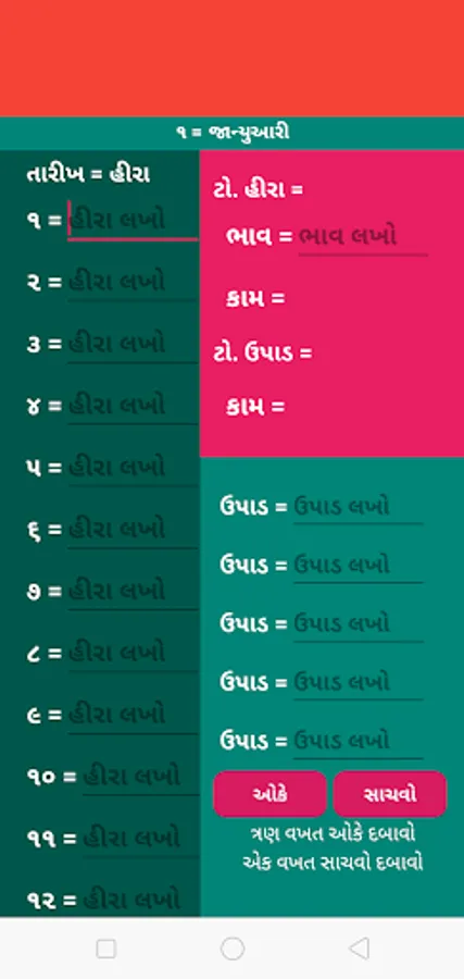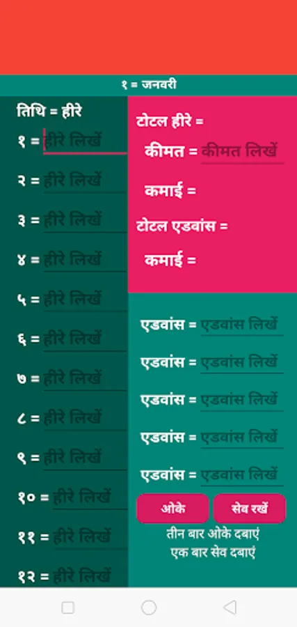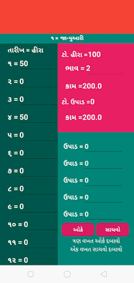 With the help of this application, artisans can keep daily accounts and twelve month accounts in their mobiles. Write the price only once and write the diamond every day. You will get the total account of the whole month in your mobile.