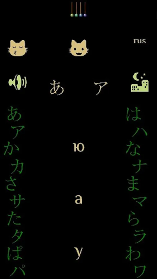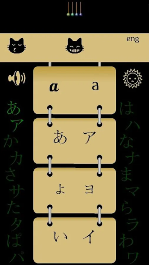 Hirakana allow you to learn japanese alphabet, set the symbols groups for learning, and your results will be saved inside app. If you wish, you can clear the results, with pressing cat head symbol on left on screen. Speaking of new question can be muted. The screen foreground color and background color can be interchanged.
