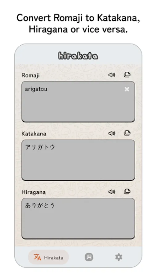 Hirakata is an app that allows you to translate from Romaji to Hiragana, Katakana & Kanji, or vice versa.