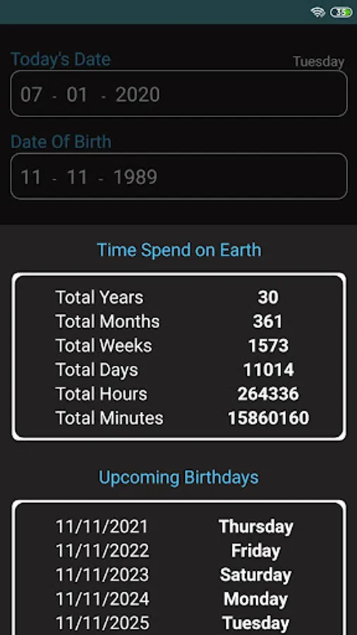 This application provide a simple user interface easy to use. Just pick your birth day. Age Calculator provide your Total AGE & Next Birthday & List of Upcoming Birthdays.
