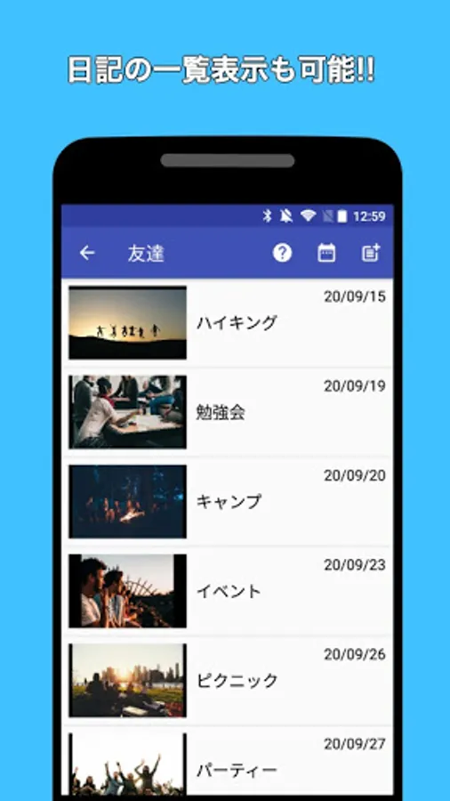 You can also display a list of diary. You can easily switch between calendar display and list display from the icon at the top of the screen.