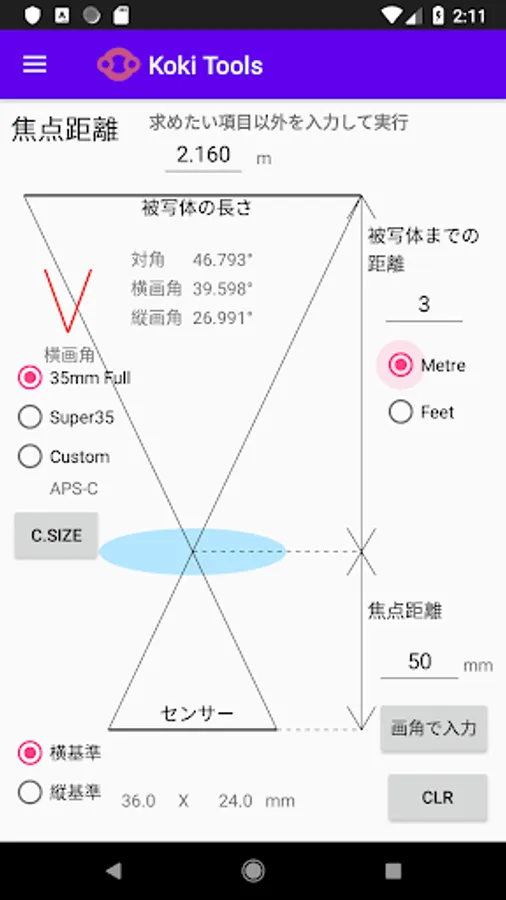 The focal length calculation is obtained by inputting two items other than the desired item.