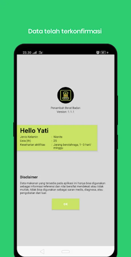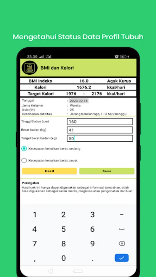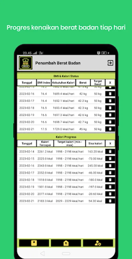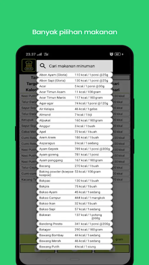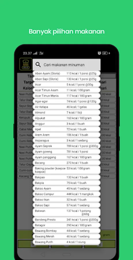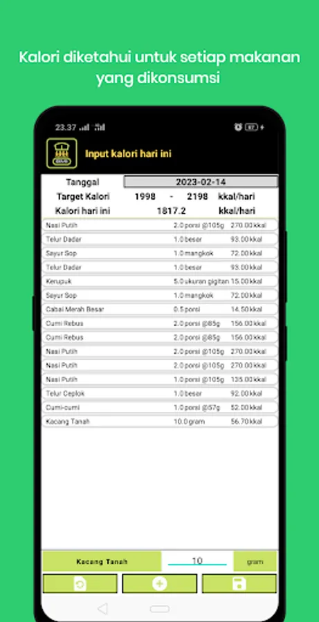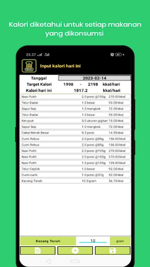 After finishing getting the profile, every day the user must record the food or drink consumed, the recording is in order to calculate the calories consumed with the target calorie consumption that must be achieved.