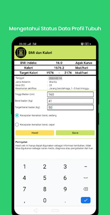 Users will find BMI and calorie profiles from data on weight, height, age, activity, as well as gender.