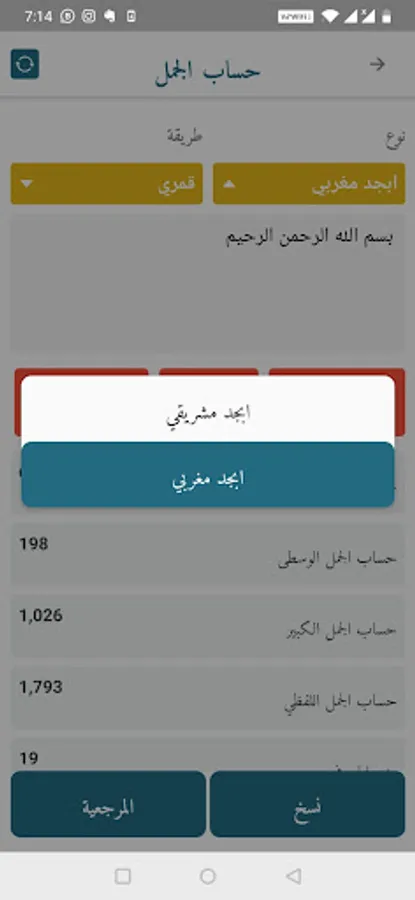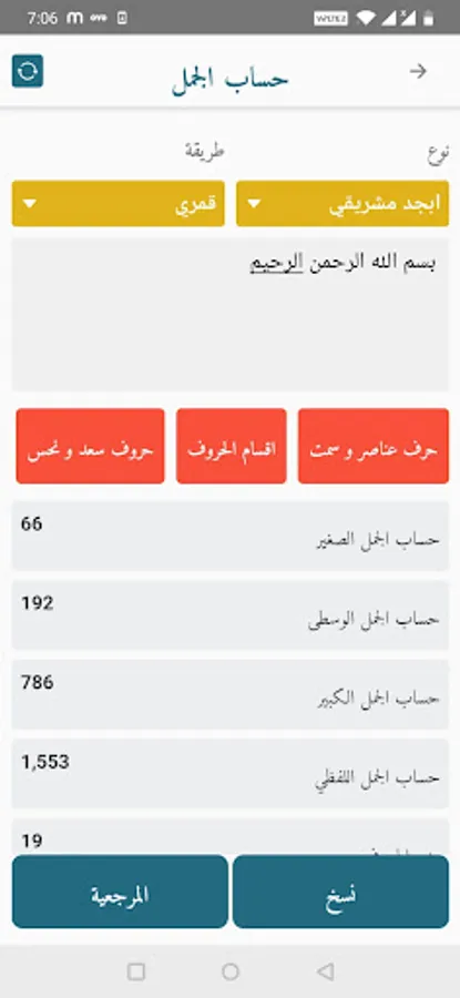 حساب الجمّل الكبير، حساب الجمّل الوسطی ، حساب الجمل الصغیر ؛حساب الجمّل اللفظی ، حساب الشمسی ، حساب القمري