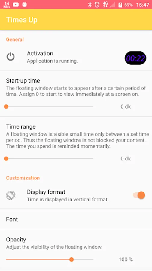 * You can alert yourself with specific time intervals. So the floating window does not prevent your content constantly. For example, the elapsed time is displayed at every five minutes.