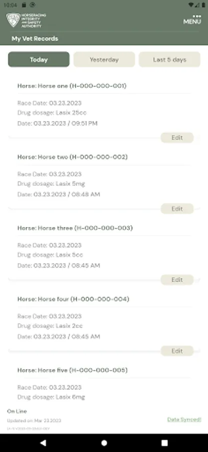 The Lasix app, designed by the Horseracing Integrity and Safety Authority, enables Lasix Veterinarians to record treatments for multiple horses without having to go on the HISA portal. The app is designed to work when connected to the internet or when the user is offline, to ensure treatments can be captured in real time. Data that is captured offline, will automatically sync when the user opens the app when they have reconnected to the internet.