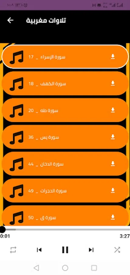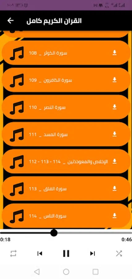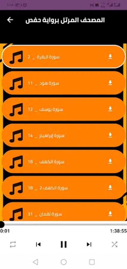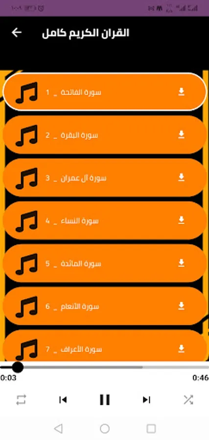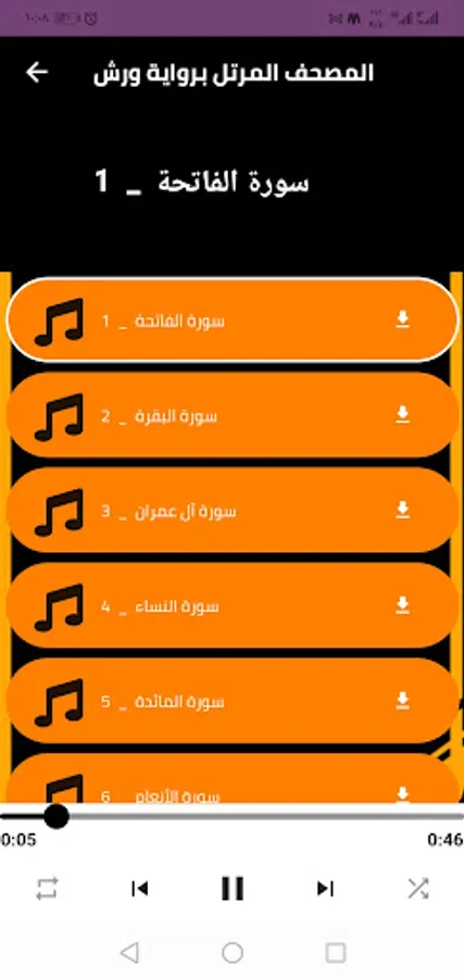 ⬅️ The interface of the Reciter Hisham Al-Hazar program, with the narration of the Holy Qur’an workshops, is very simple, which enables you to use the program and listen to Hisham Al-Hazar’s complete Quran without the net, with ease and ease.
