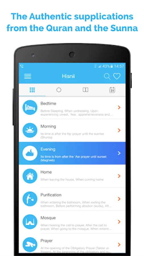 • Invocations organized in 24 categories (supplications for sleep, morning supplications, evening supplications, for fasting, for the pilgrimage, for marriage, for the prayer, ...)