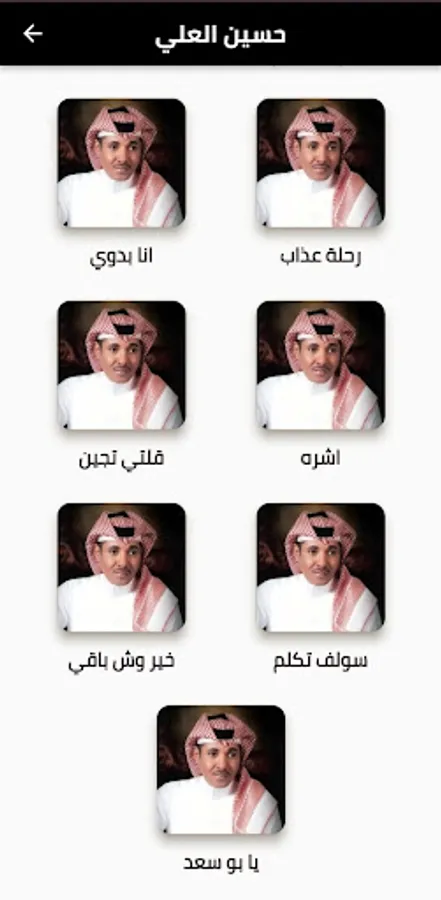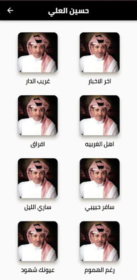 The application contains the songs of the Saudi artist, singer Hussein Al-Ali