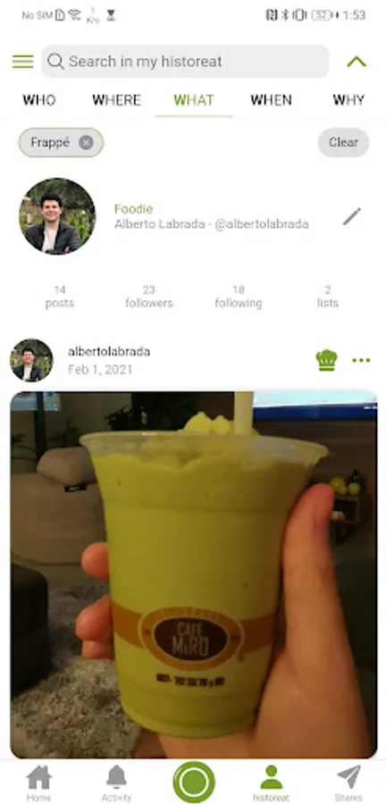 Connect with your friends, share what you eat or drink, see what's new to eat within a network of foodies all over the world. Add to your very own eating history to highlight the food you want to share with your friends. When asked for or wanting to give a a recommendation on what to eat don't worry about having to remember the specifics, you can now reference your historeat. Start sharing and let's make historeat together!