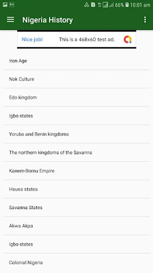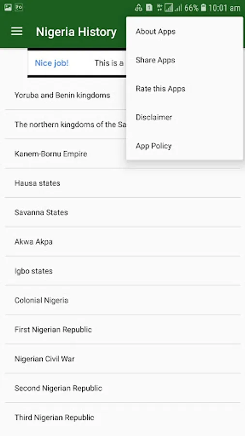 This History of Nigeria app has a history of Prehistory period, Early history period, Pre-colonial period, British period, First republic, Civil war, Second republic, Third republic, Fourth republic. This app have a lot of information about Civil War, British period, First Republic & etc. Events are segregated into the form of different topics and chapters.