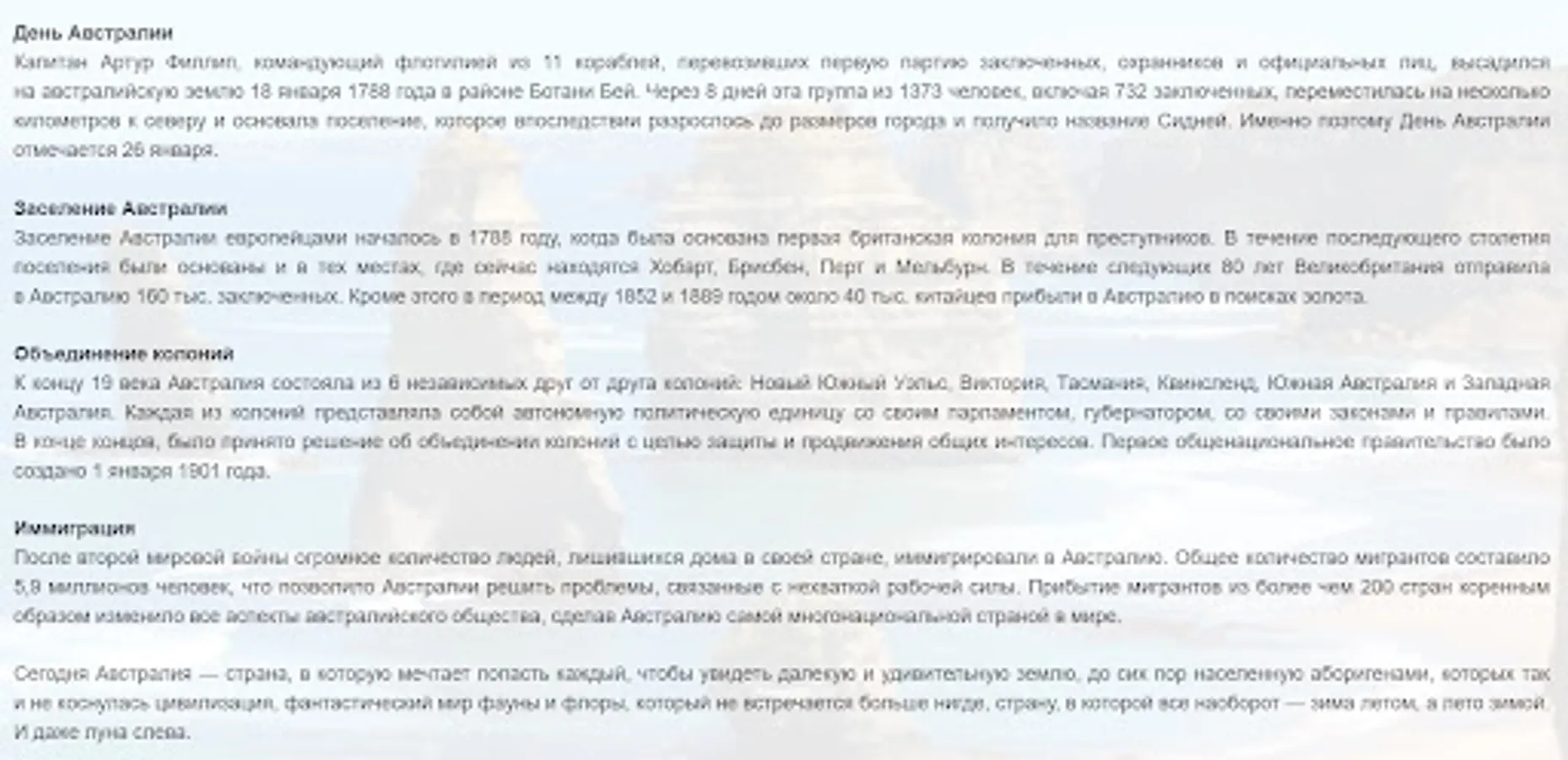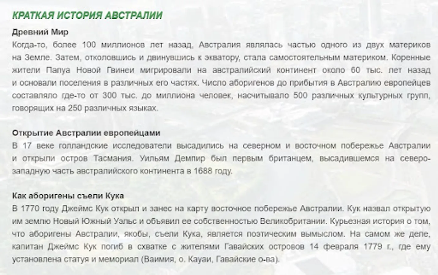 Австралия была заселена примерно 50 000 лет назад, остатками её коренного населения являются австралийские аборигены. Документированная история Австралии начинается с её открытия европейцами в начале XVII века.