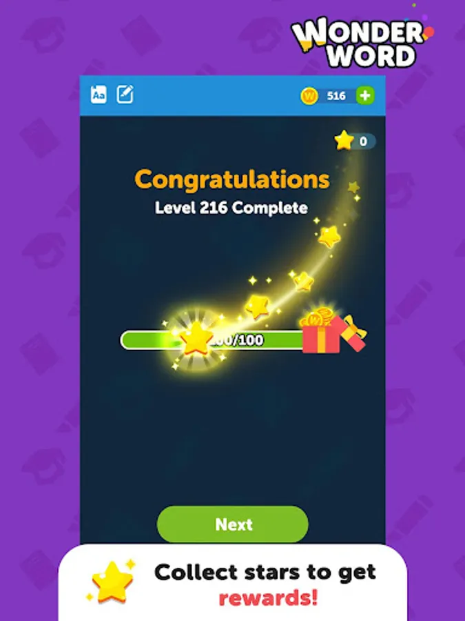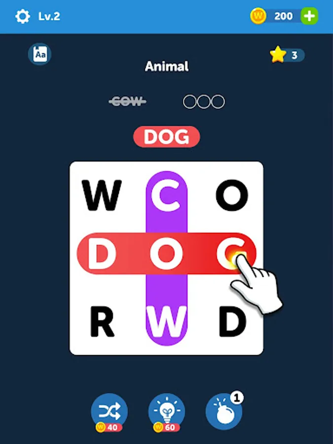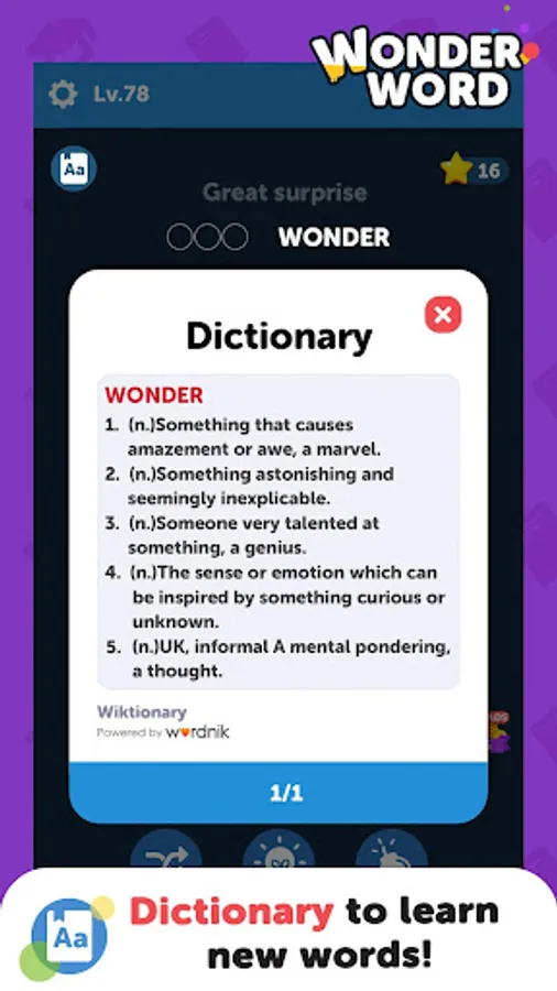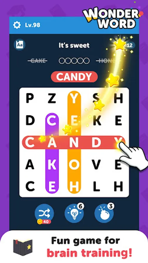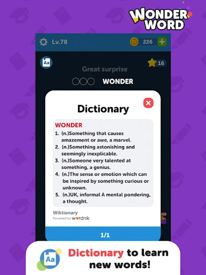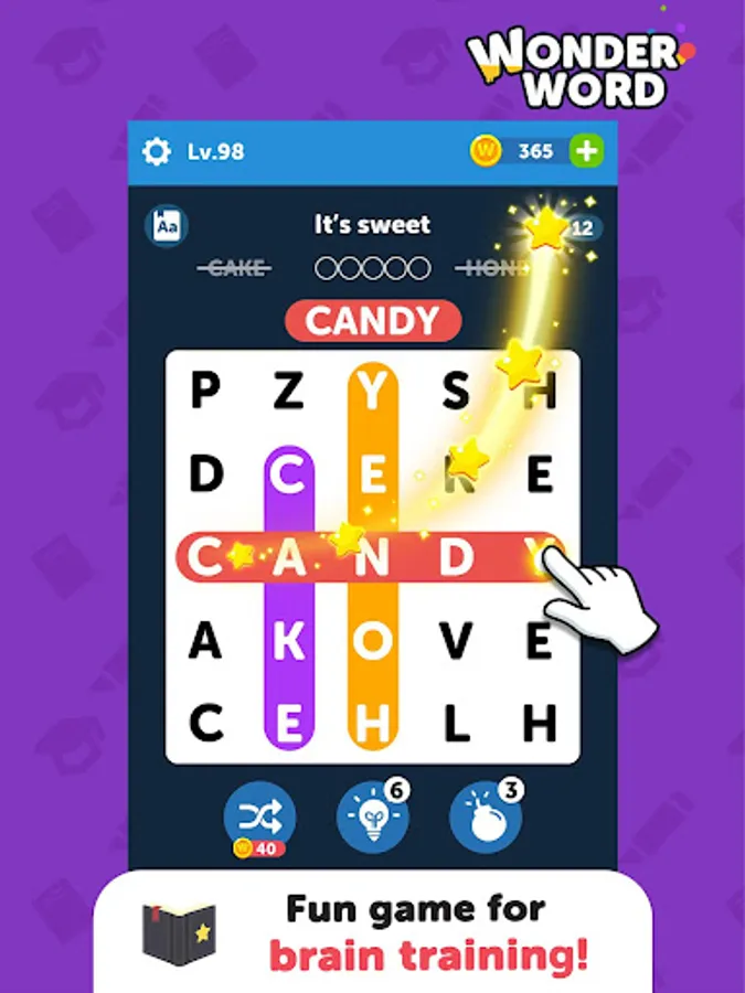In Wonder Word, there are 1000+ fun, challenging puzzles. In each puzzle, you can search the board, link the letters and spell the words. By playing, you will boost your brain power and keep your mind sharp. It will make you a word master and take you on a fun word search adventure!