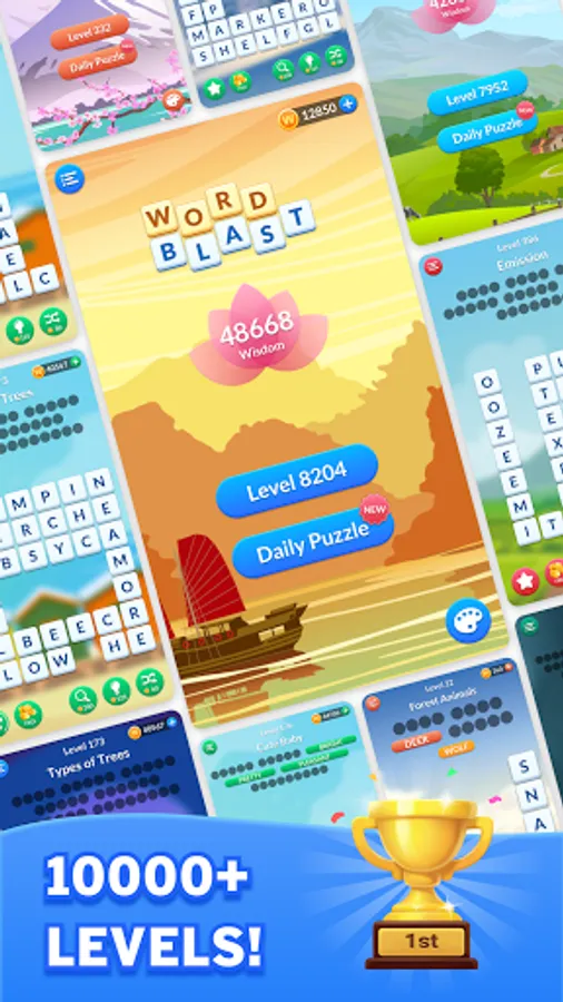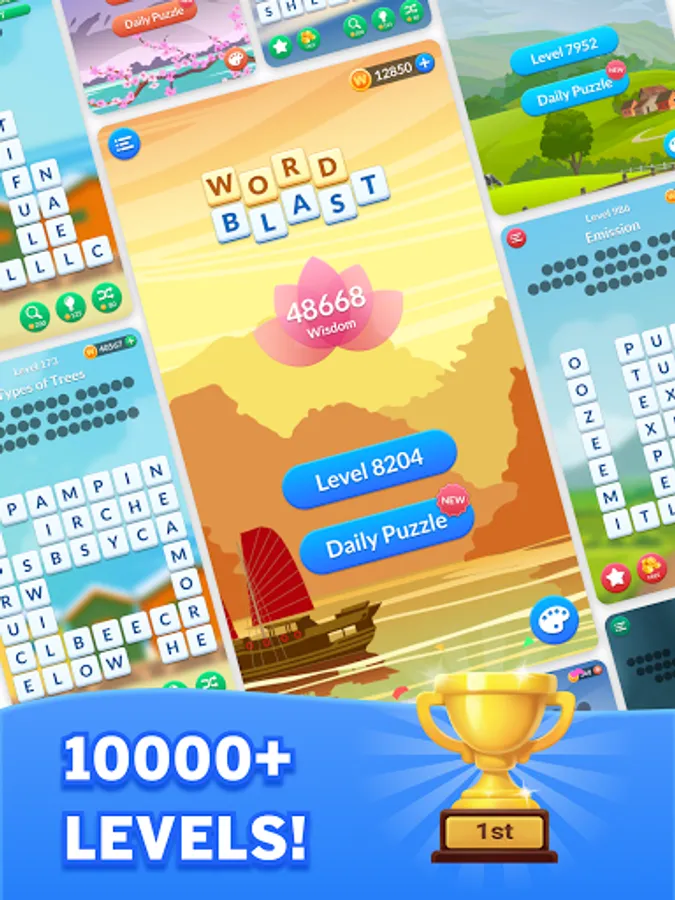 The new free word game is full of delightful game modes, features and challenges. Search and blast words to unlock rewards, themes and new features. The more words you blast, the more Wisdom points you’ll get on the game board.