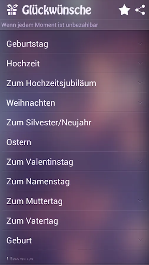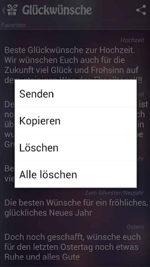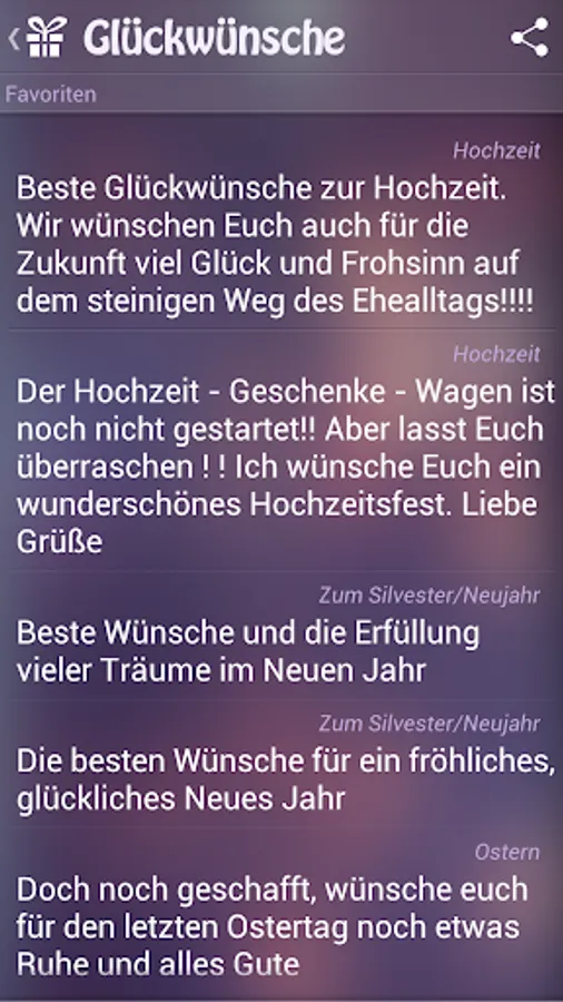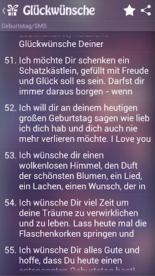 In our app you will find congratulations, wishes for many occasions, contemplative, original or funny greeting ideas for greeting cards, congratulations SMS, email or as a greeting to a gift.