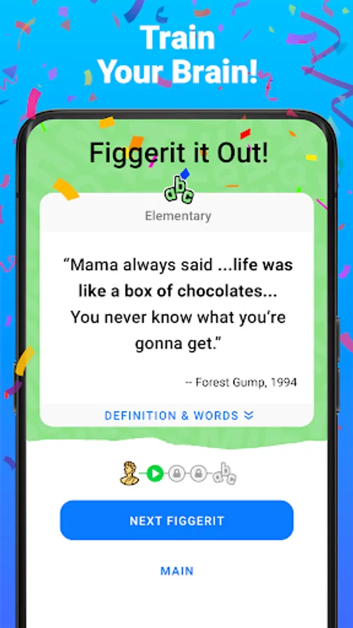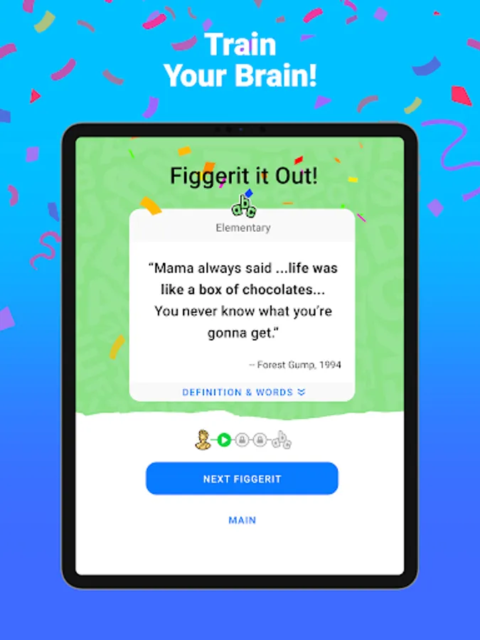 Figgerits is a brain word connect puzzle game. When the mind task is completed, it will yield a little truism written onto the solution dashes.