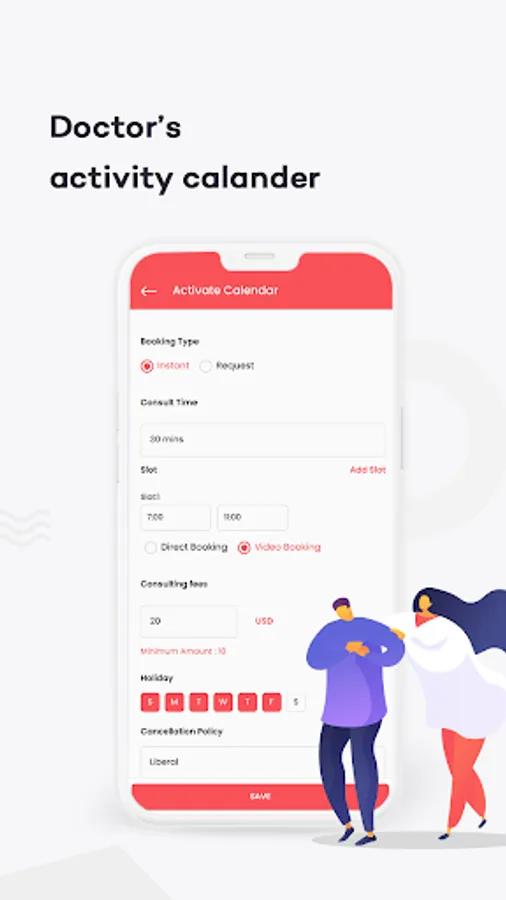 Availability setting feature that allows the doctors to set their availability details clearly such as consultation timings, direct visit booking/video booking details, and so on.