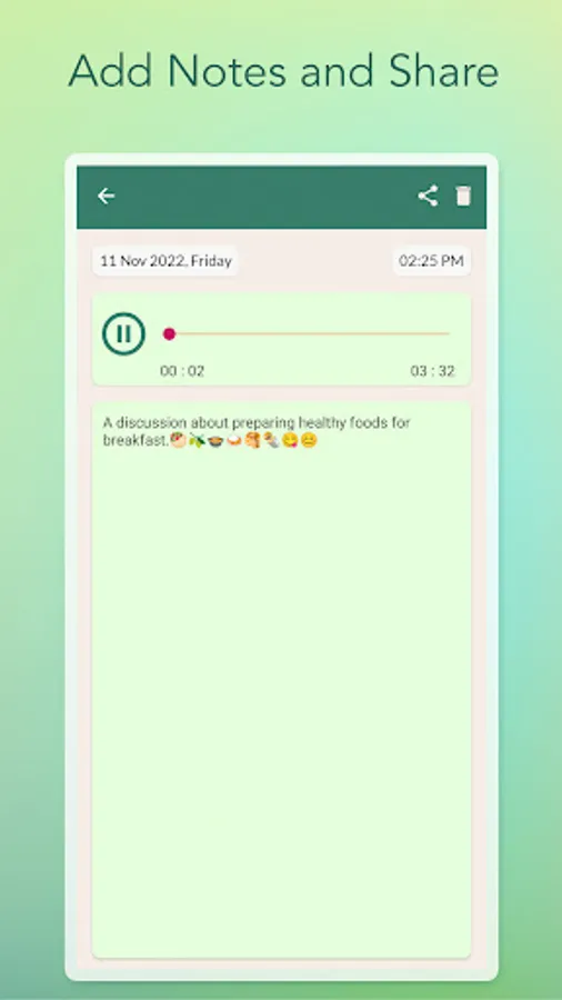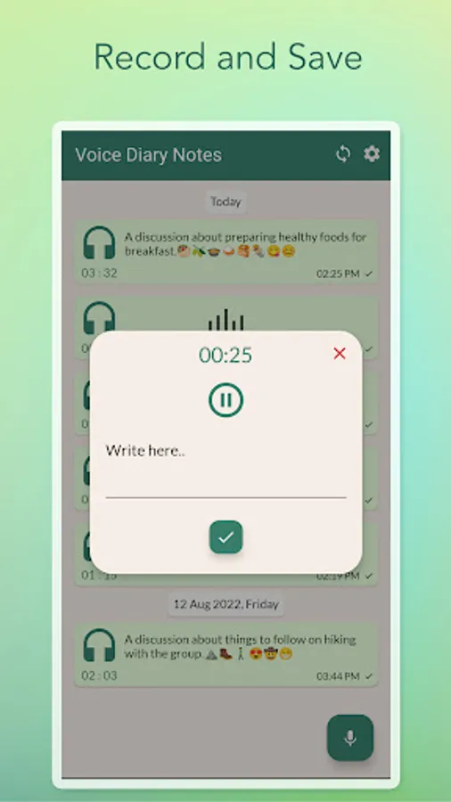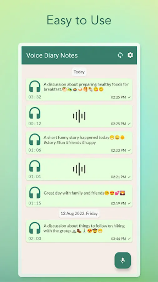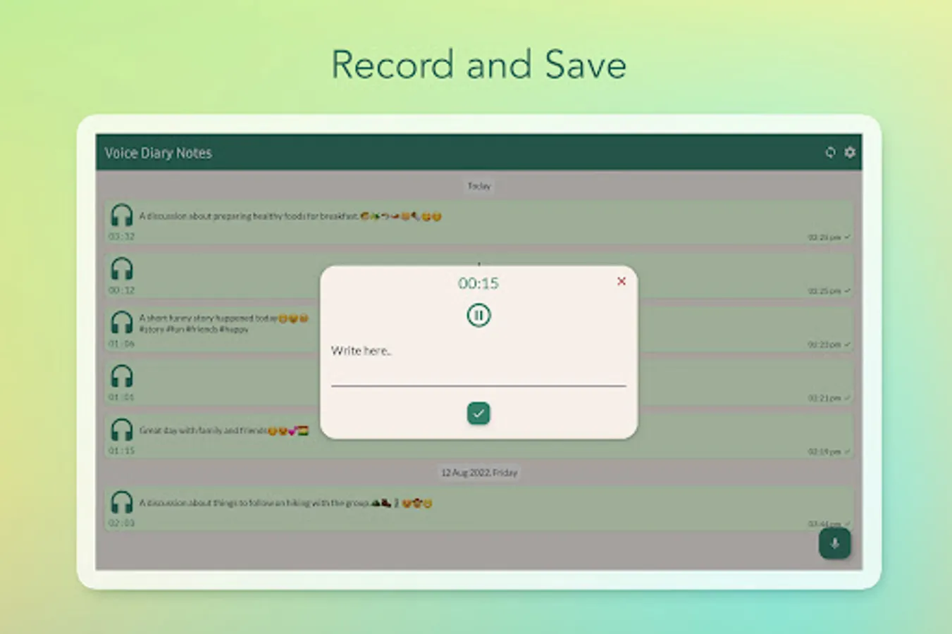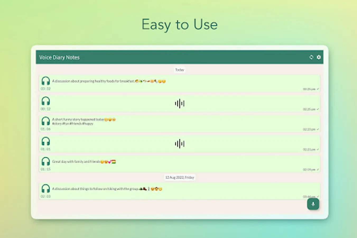 A voice diary can be a huge help in organizing your thoughts before writing. The share option also allows you to share your ideas with your friends. This diary is developed with a simple chat-like user interface for easy recording.
