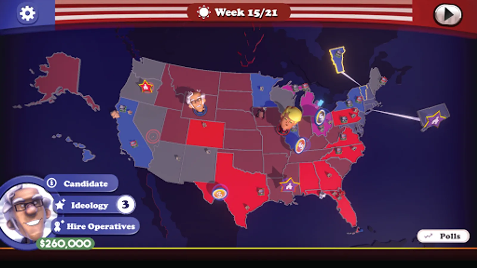* Manage your Campaign Budget - Purchase advertisements, travel across the country to campaign, and hire operatives to enhance your PR or cripple your opponent. Be wary - if you overspend and need extra cash, it might come from somewhere that will shake voters’ confidence in you!